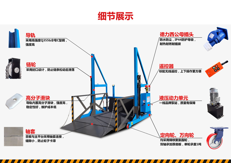 2. 液压系统:泵站、油缸,实现平稳升降,匹配不同车厢高度;部分手动液压款无需接电,电动款支持遥控;
